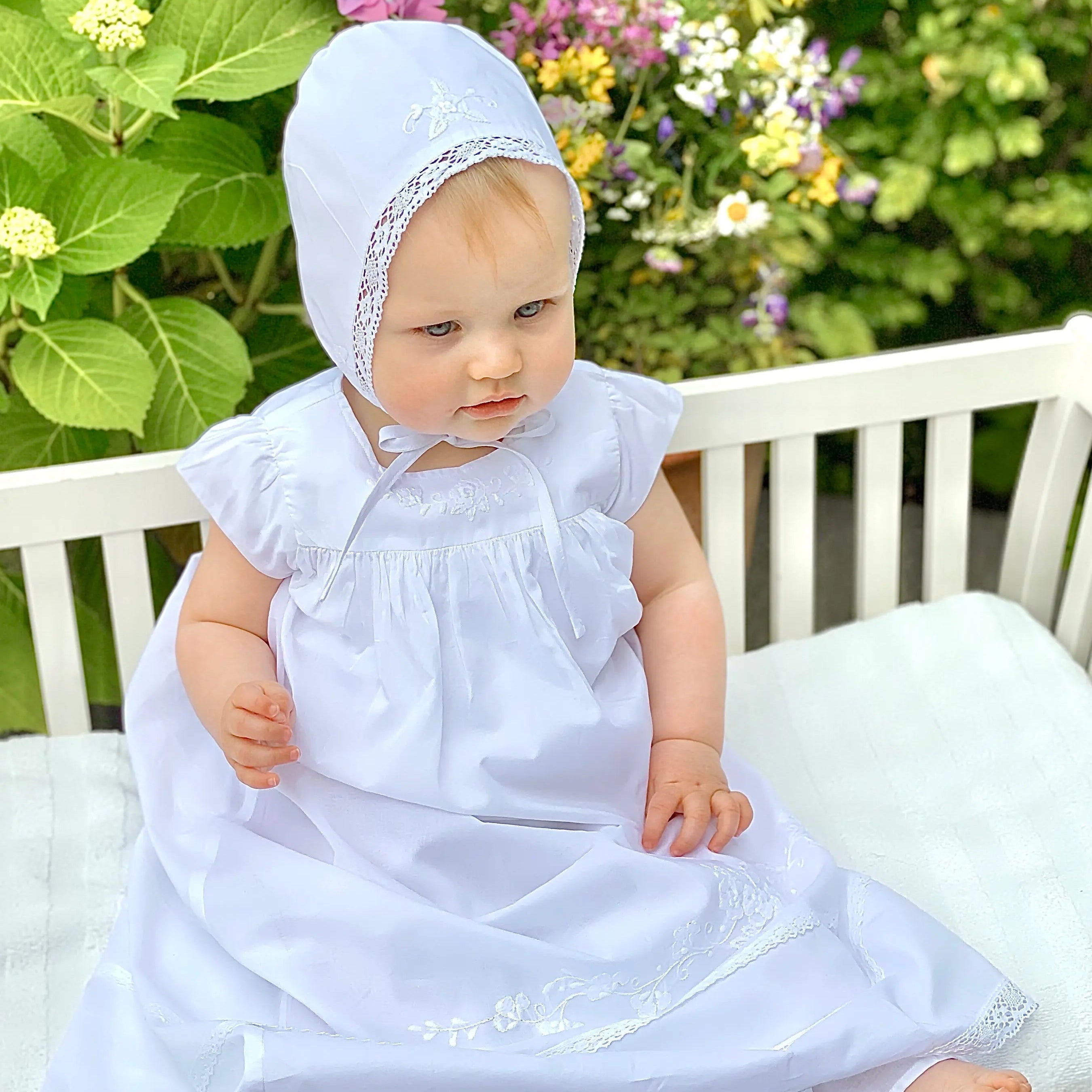 Choose a matching bonnet or headband and don't forget the stylish garment bag and hanger for safe storage and preservation of your precious heirloom christening gown, so it can be passed on for generations.